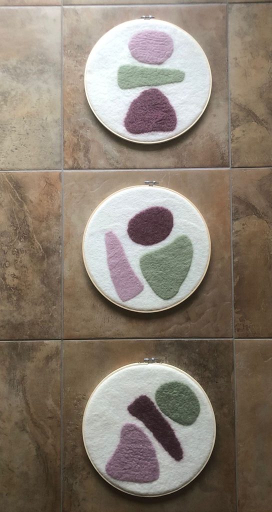 3 schilderijen met 3 keien van steeds verschillende en ook dezelfde kleuren.