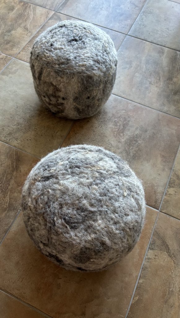 Een poef geheel van schone en gekaarde wol. Droog (prikken) vilten.